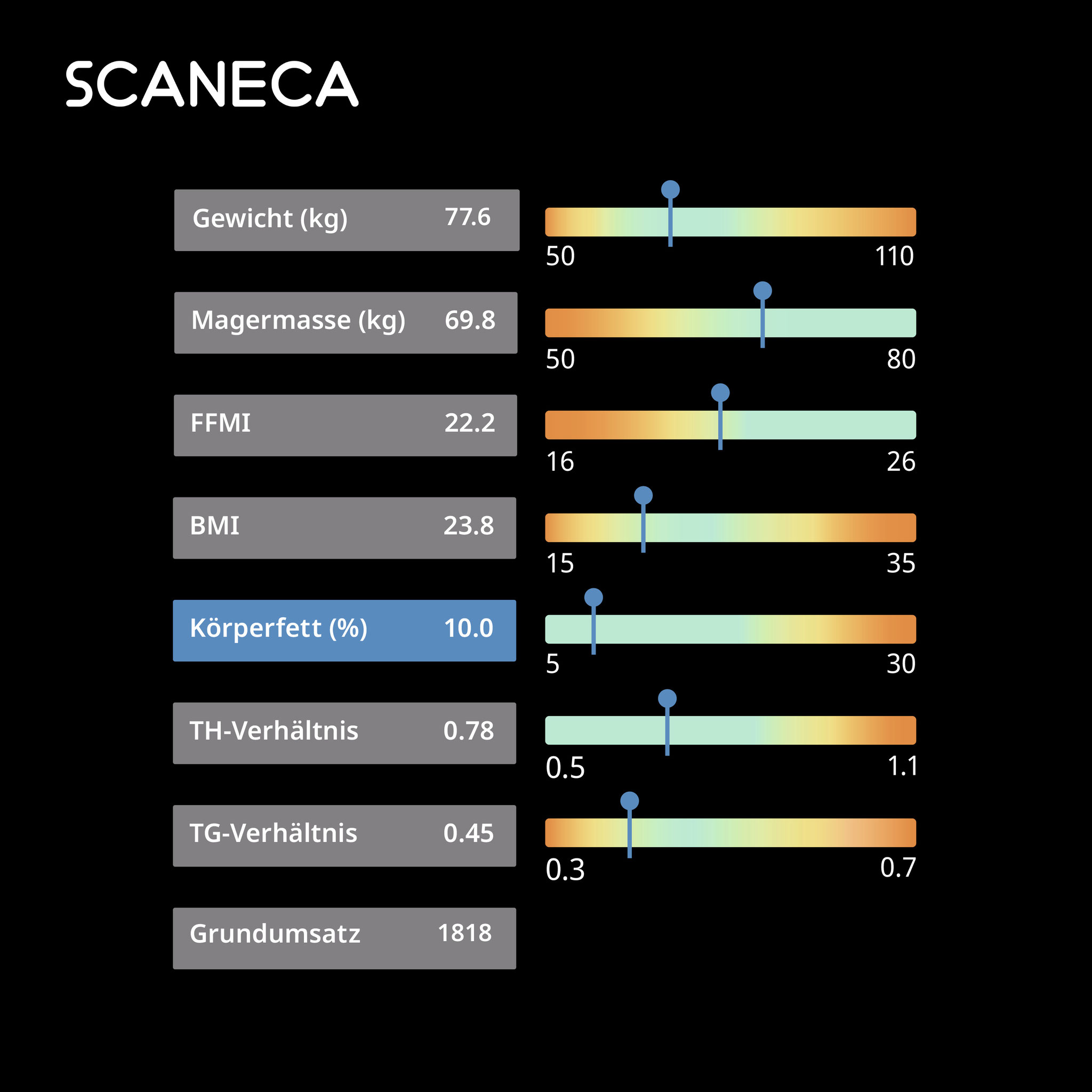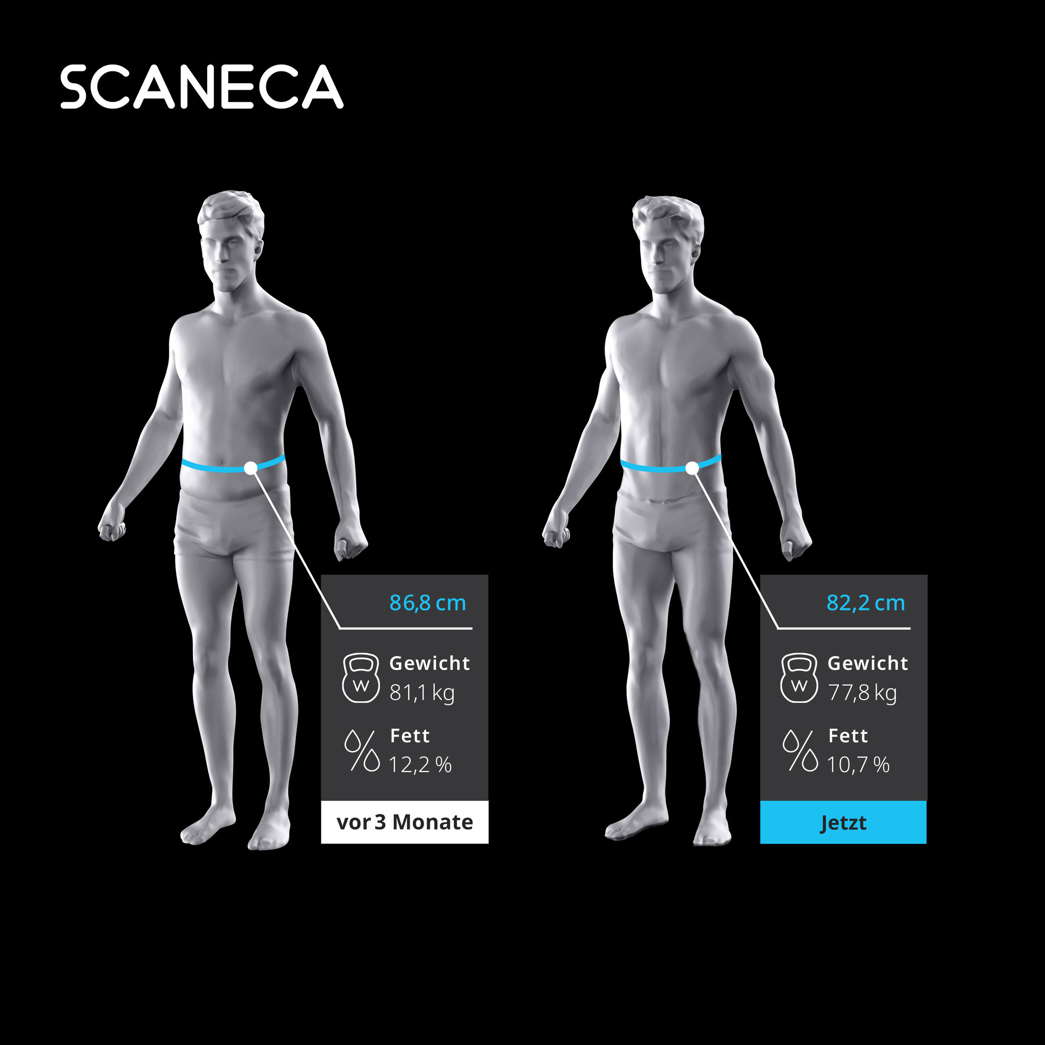 Insgesamt ermöglicht Ihnen die Scaneca-Körperanalyse eine ganzheitliche Betrachtung Ihres Körpers – objektiv, visuell nachvollziehbar und absolut messbar. Ideal für alle, die ihre Fortschritte transparent verfolgen und ihre Trainings- oder Gesundheitsziele wissenschaftlich fundiert erreichen möchten.